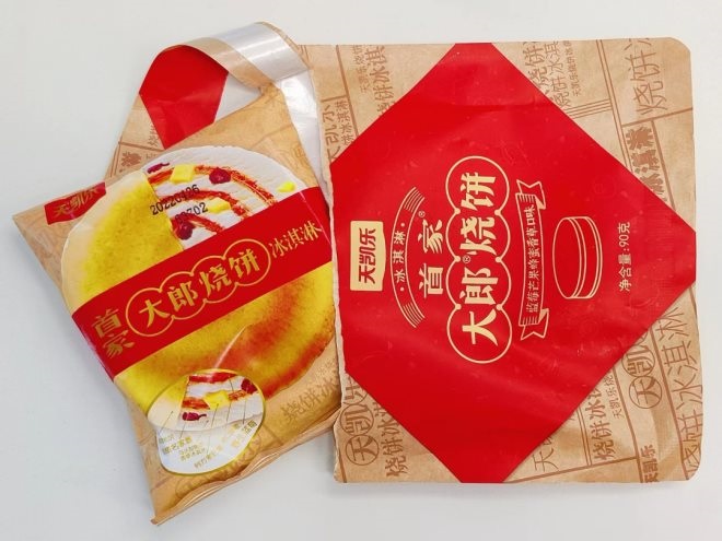 比如內(nèi)參君前兩天吃了一個“大郎燒餅冰淇淋”,圓滾滾的外形,很吸引人注意。這款冰淇淋外側(cè)是一層香脆威化餅,里面則是蜂蜜香草,同時伴隨著藍(lán)莓和芒果果肉。9.9元的價格放在711便利店的冰柜里,也算合理。