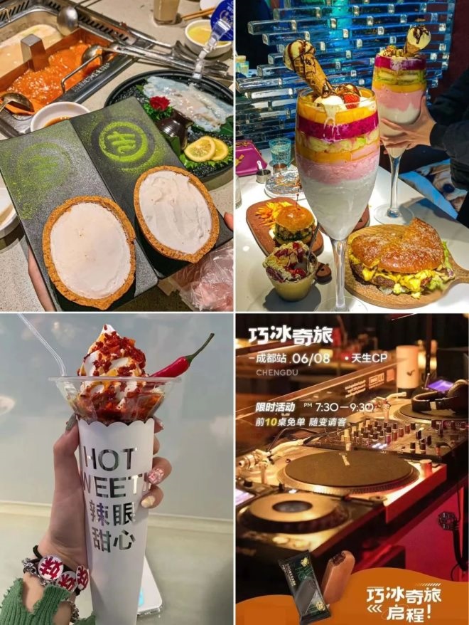 海底撈上新椰子雪糕,“連殼都能吃”很快在社交媒體打響;胖妹面莊的“辣椒冰淇淋”,冰淇淋蘸辣椒的奇異組合,配上“辣眼甜心”的SLOGAN非常出圈;武漢有一家漢堡專門店,“巨型冰淇淋彩虹杯”也是吸睛產(chǎn)品,將近1米高的冰淇淋杯,不求光盤,只求“出片”;蒙!半S變”和成都的拿椒唱片火鍋合作,蹦迪+火鍋+冰淇淋,三重釋放同時燥熱夏季……