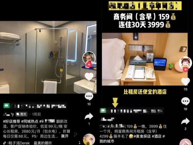 于旅客而言,長租酒店有著公寓所不具備的優(yōu)勢;于酒店來說,又可解燃眉之急。在互惠互利的雙向便利下,關(guān)于酒店長租的視頻、帖子在各大社交平臺(tái)刷屏。抖音上,酒店長租相關(guān)視頻、圖集隨處可見,文案包括但不限于酒店的超低價(jià)格、基礎(chǔ)設(shè)施介紹及周邊配套設(shè)施的介紹等;在小紅書搜索“酒店長租”,相關(guān)筆記超2萬篇。