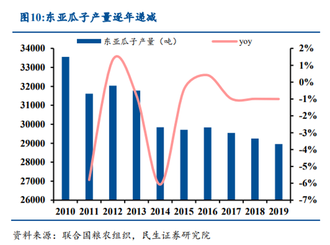 此外,東亞地區(qū)瓜子產(chǎn)量從2015年起進(jìn)入下行期,維持在3萬(wàn)噸以下,這也能從側(cè)面印證了中國(guó)瓜子人均消費(fèi)量遇到瓶頸。