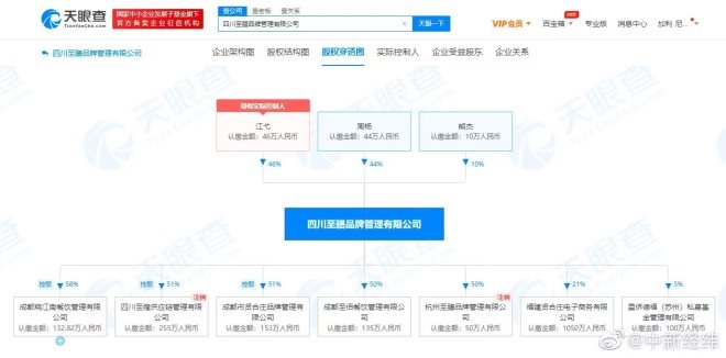 天眼查APP顯示,四川至膳品牌管理有限公司成立于2017年4月,法定代表人羅毅,注冊資本為100萬元人民幣,股東信息顯示,該公司由江弋、周楊、熊杰分別持股46%、44%、10%。