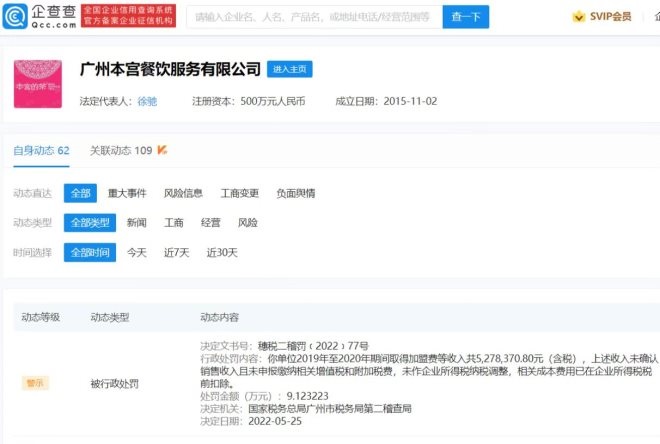 企查查APP顯示,近日,本宮的茶關(guān)聯(lián)公司廣州本宮餐飲服務(wù)有限公司因偷稅被廣州市稅務(wù)局第二稽查局罰款9萬元。
