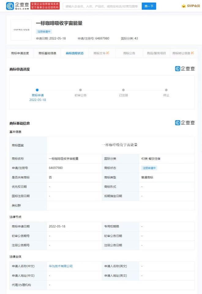 企查查APP顯示,近日,華為技術(shù)有限公司申請注冊了兩個咖啡商標(biāo)。一商標(biāo)名為“一標(biāo)咖啡吸收宇宙能量”,國際分類為43類餐飲住宿,服務(wù)內(nèi)容有咖啡館、餐廳、飯店、流動飲食供應(yīng)等;另一商標(biāo)名為“一杯咖啡吸收宇宙能量”,國際分類為30類方便食品。