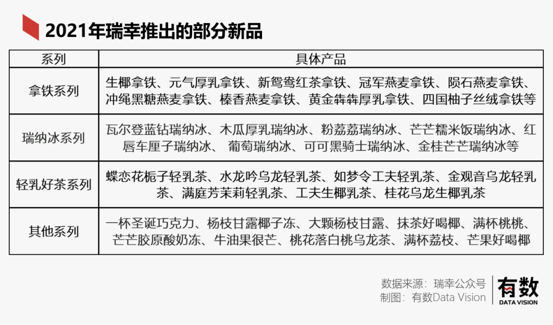 2021年全年,瑞幸共推出了113款全新現(xiàn)制飲品[4],1:113的爆款比例,你細(xì)品。隔壁奈雪的茶2021年共推出41款,瑞幸出新款的速度是其三倍。大有一款款試,直到試出爆款的味道在。