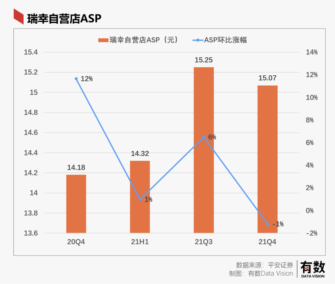 在2021年,瑞幸的平均銷售價(jià)格(ASP)終于成功的從14塊站上了15塊。這主要是由于瑞幸雖然還在發(fā)券,但顯然是越來越少了。