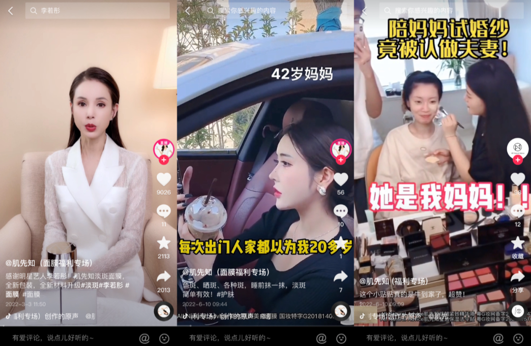 因此,肌先知發(fā)布內(nèi)容有著明顯的策略調(diào)整:短劇元素注重家庭生活場景,達人選用空姐這一類有著得體社會形象的高知白領(lǐng),明星則選用李若彤、李小冉、閆妮。而在具體文案中,肌先知也反其道而行之地宣稱,產(chǎn)品做不到立竿見影,需要堅持使用才能看到效果。