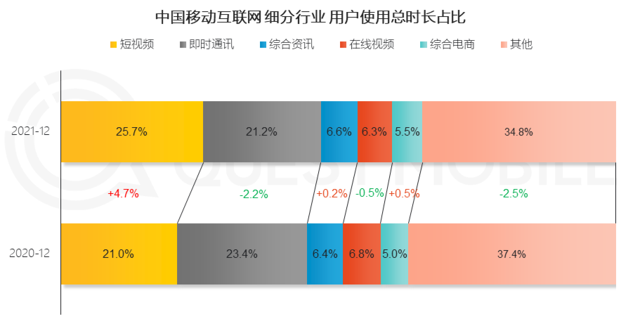 這也指向了未來的“人貨場”變革之路:當消費者的生活必需品得到較好滿足后,以迎合情緒、興趣、偏好為主的非必需品決策鏈路更短,在興趣電商的貨架上會有更好的呈現(xiàn)效果。Quest Mobile顯示,2021年在用戶使用時長方面,短視頻已超過即時通訊,占比達25.7%。