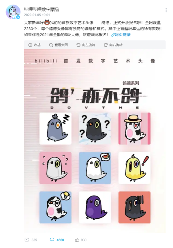 在大廠自我閹割的同時,小一些的平臺已經(jīng)開始試探。野心最大的是b站,滿30天即可轉(zhuǎn)贈。它推出的數(shù)字藏品“鴿德”,更是賦予收藏者商業(yè)開發(fā)權(quán),也就是說,用戶可以拿著鴿德的形象去做周邊,實(shí)現(xiàn)二次變現(xiàn)。但在其他平臺,數(shù)字藏品的版權(quán)歸屬還是作者,買家是不可以隨意修改使用的。
