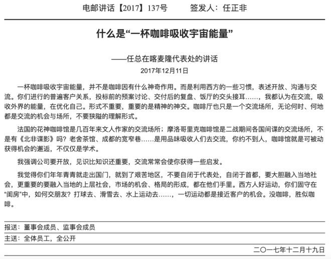 更廣為人知的是任正非于2017年12月11日在喀麥隆代表處的講話,他解釋了“一杯咖啡吸收宇宙能量”的內(nèi)涵:“利用西方的一些習(xí)慣,表述開放、溝通與交流。你們進行的普遍客戶關(guān)系,投標(biāo)前的預(yù)案討論、交付后的復(fù)盤、飯廳的交頭接耳……我都認(rèn)為在交流,吸收外界的能量,在優(yōu)化自己。形式不重要,重要的是精神的神交?Х葟d也只是一個交流場所,無論何時、何地都是交流的機會與場所,不要狹隘的理解形式”。