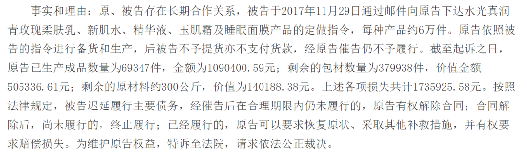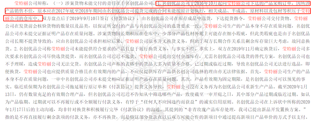 兩筆庫(kù)存,兩起案件。根據(jù)瑩特麗與名創(chuàng)優(yōu)品定作合同糾紛民事一審民事判決書(shū)顯示,原告瑩特麗訴稱,名創(chuàng)優(yōu)品于2017年11月29日通過(guò)郵件向其下達(dá)水光真潤(rùn)青玫瑰柔膚乳、新肌水、精華液、玉肌霜及睡眠面膜產(chǎn)品的定做指令,每種產(chǎn)品約6萬(wàn)件,撎佧愐勒罩噶顐湄浐蜕a(chǎn),后被告不予提貨亦不支付貨款,經(jīng)催告仍不予履行。