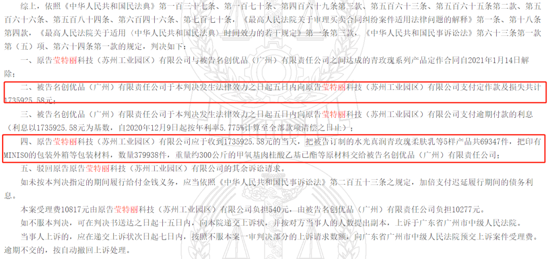 在這起案件中,名創(chuàng)優(yōu)品同樣敗訴。判決書(shū)顯示,雙方青玫瑰系列產(chǎn)品定作合同自解除;名創(chuàng)優(yōu)品向瑩特麗支付定作款及損失共計(jì)173萬(wàn)余元;同時(shí),瑩特麗也要將水光真潤(rùn)青玫瑰柔膚乳等5樣產(chǎn)品,把印有MINISO的包裝外箱等包裝材料,以及原材料交給被告名創(chuàng)優(yōu)品。