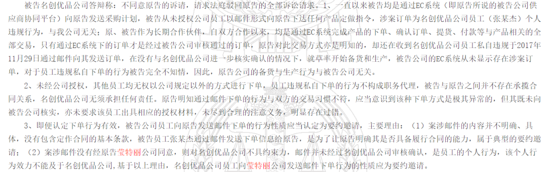 在定作合同糾紛案中,名創(chuàng)優(yōu)品辯稱,其一直是通過(guò)EC系統(tǒng)(供應(yīng)商協(xié)同平臺(tái))向瑩特麗發(fā)送采購(gòu)計(jì)劃,涉案訂單為名創(chuàng)優(yōu)品公司員工(張某杰)個(gè)人違規(guī)行為,與公司無(wú)關(guān)。作為長(zhǎng)期的合作伙伴,自合作以來(lái),均是通過(guò)EC系統(tǒng)完成產(chǎn)品相關(guān)交易,只有通過(guò)EC系統(tǒng)下的訂單才是經(jīng)過(guò)被告公司審核通過(guò)的訂單,原告對(duì)此交易方式亦是明知的,但未盡到合理的注意義務(wù),明顯存在過(guò)錯(cuò)。