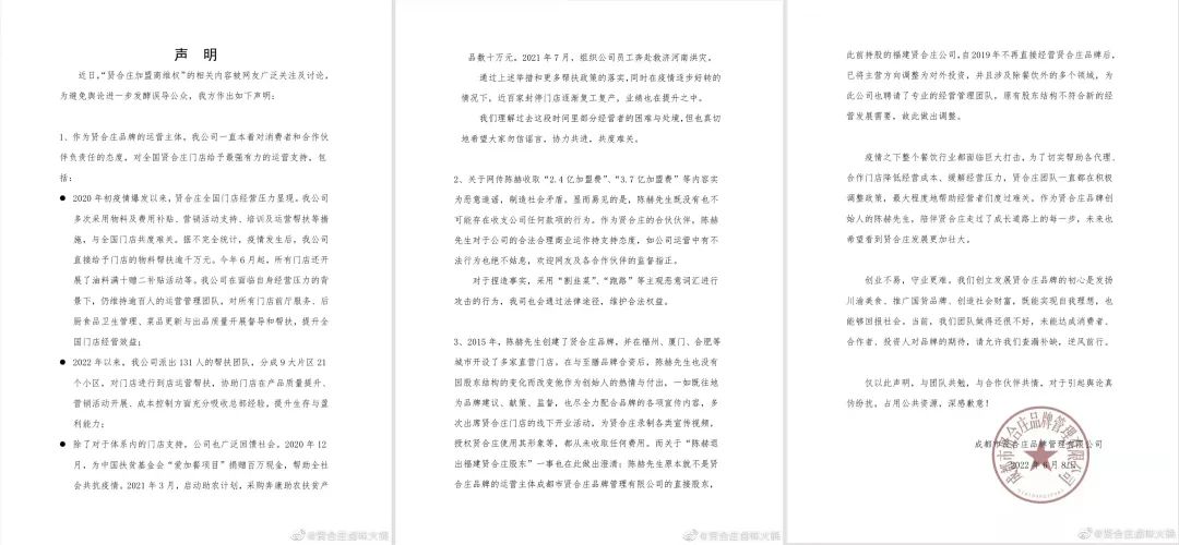 近日,針對“加盟商維權(quán)”糾紛,賢合莊鹵味火鍋發(fā)出“嚴(yán)厲”聲明,引社會廣泛關(guān)注。