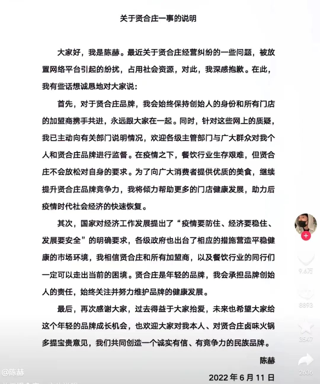 今天(6月11日),陳赫也對賢合莊經(jīng)營糾紛進(jìn)行了回應(yīng)道歉稱:會始終保持創(chuàng)始人的身份和加盟商攜手共進(jìn)。同時,針對網(wǎng)上的質(zhì)疑,已經(jīng)主動向有關(guān)部門說明情況。
