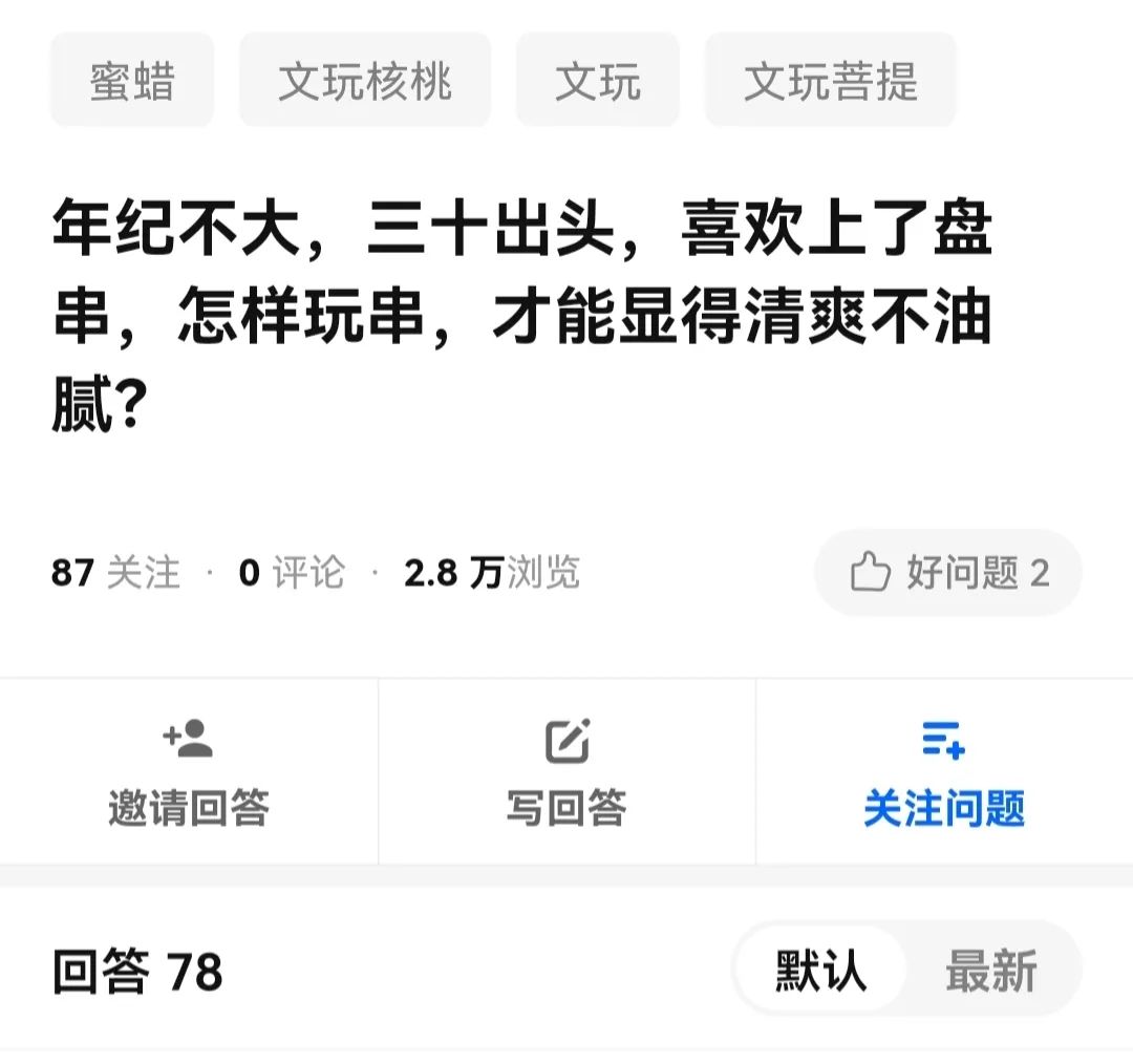 知乎上,一位三十出頭的男性提出疑問:“最近喜歡上了盤串,怎樣玩串才能顯得清爽不油膩?”78個回答中,有人無情吐槽:盤串這種行為本身就很油膩中年。