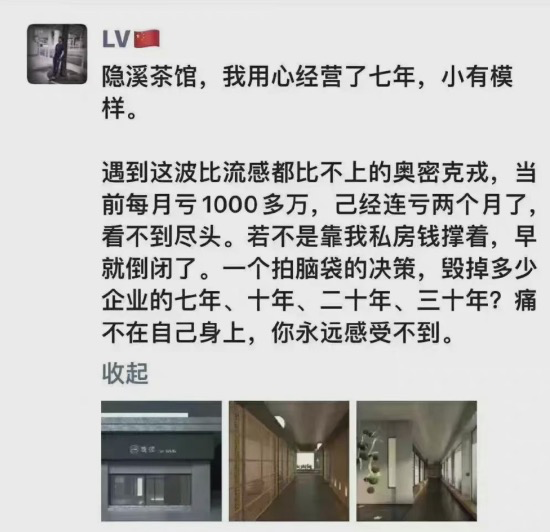 與此同時,上海知名的茶館品牌--隱溪茶館,受疫情影響,連續(xù)兩個月,每月虧1000多萬。