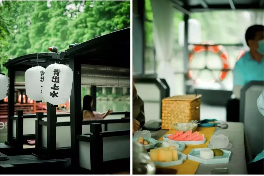 此外,茶文化極度繁盛的杭州,不僅有靠著西湖邊、大運河邊的茶館,還有船上茶館,像這家青出上水,就是杭州首家的河上茶坊,小船非常日系,上船前可以選擇自己喜歡的茶水、糕點,一邊行船,一邊品茶。