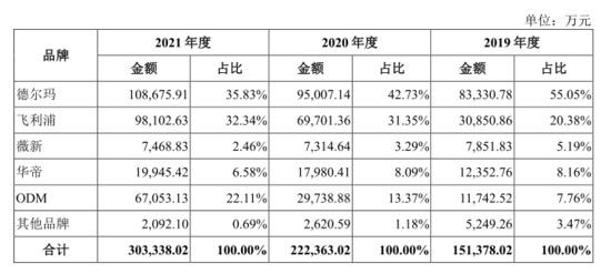 招股書顯示,截至到2021年,飛利浦及華帝品牌營(yíng)收之和占比已經(jīng)達(dá)到38.92%,超過德爾瑪自有品牌“德爾瑪”和薇新營(yíng)收之和占比的38.29%。