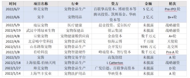 2022年寵物賽道部分投融資事件,36氪根據(jù)天眼查數(shù)據(jù)整理制圖