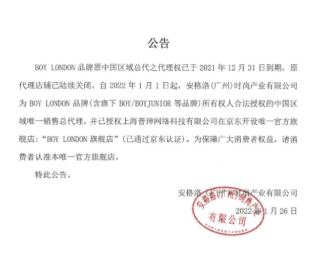從上述店鋪的一則公告中可知,BOY LONDON品牌原中國區(qū)域總代之代理權已于2021年12月31日到期,原代理店鋪已陸續(xù)關閉。