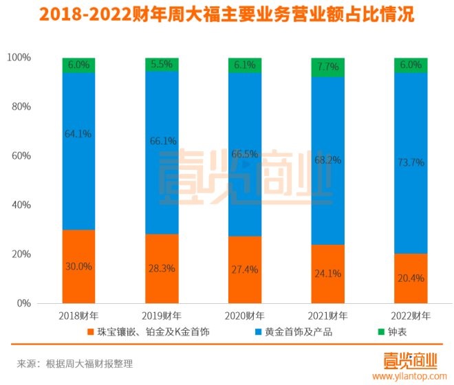從近幾年經(jīng)營(yíng)發(fā)展來(lái)看,鐘表業(yè)務(wù)在營(yíng)業(yè)額占比上并沒(méi)有較大變化,珠寶鑲嵌、鉑金及K金首飾業(yè)務(wù)在營(yíng)業(yè)額占比上則持續(xù)減小,相應(yīng)的,黃金首飾及產(chǎn)品系列業(yè)務(wù)的營(yíng)業(yè)額占比不斷增大,在2022財(cái)年中達(dá)到近5年以來(lái)的最大值,為73.7%。顯然,黃金首飾及產(chǎn)品業(yè)務(wù)越來(lái)越成為周大福營(yíng)收的最大支柱。而且,周大福在財(cái)報(bào)中表示,黃金首飾及產(chǎn)品在2022財(cái)年取得大幅增長(zhǎng)的原因,是因?yàn)橹艽蟾鞒邢盗欣^續(xù)取得成功,再加上其對(duì)較次級(jí)城市落實(shí)的零售擴(kuò)張策略,有助的推動(dòng)了黃金產(chǎn)品類別的銷售。