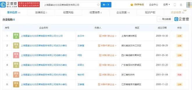 企查查APP顯示,目前,露華濃上海有限公司和上海露富達(dá)化妝品營(yíng)銷(xiāo)服務(wù)有限公司在國(guó)內(nèi)的分支機(jī)構(gòu)均已注銷(xiāo)、吊銷(xiāo)。