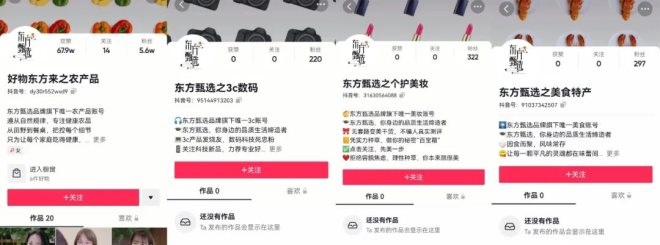 另一方面,東方甄選也開始布局多個賬號矩陣,目前新開設(shè)了農(nóng)產(chǎn)品、個護(hù)美妝、文創(chuàng)、3C數(shù)碼和美食特產(chǎn)等幾個直播間。這意味著東方甄選未來將向全品類覆蓋,塑造品牌影響力,同時培養(yǎng)更多專業(yè)性更強(qiáng)、涵蓋不同領(lǐng)域的新主播。