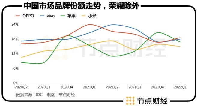 第二次下滑發(fā)生在脫離華為后。IDC數(shù)據(jù)顯示,榮耀2020年Q4的市場(chǎng)份額只有4.6%,到2021年Q1進(jìn)一步下降到4%。在2020年Q2-2021年Q1期間,其他主要品牌的市場(chǎng)份額雖然變動(dòng)不大,但總體還是呈上升趨勢(shì)。