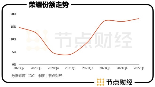 從2021年Q2開(kāi)始,榮耀的市場(chǎng)份額逐漸回升。把范圍拉長(zhǎng)到2020年Q3-2022年Q1,榮耀的市場(chǎng)份額走出了一條V型曲線(xiàn)。