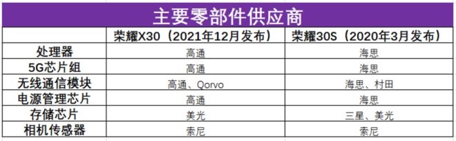 其中,榮耀X30中的大部分核心組件,如處理器、5G芯片組、電源管理芯片以及存儲(chǔ)芯片,都是由高通、美光、Qorvo等美國(guó)制造商提供的。