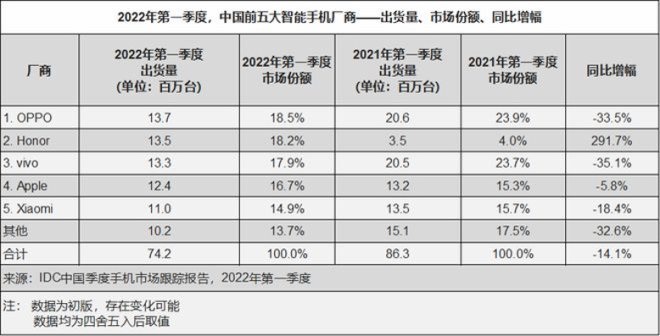 IDC數(shù)據(jù)顯示,榮耀2022年Q1的市場(chǎng)份額為18.2%,是僅次于oppo的第二名。在2020年Q4-2022年Q1期間,榮耀是市場(chǎng)前五名中市場(chǎng)份額增幅最大的,達(dá)到13.6%,其次是小米,但小米的增幅只有1.2%。