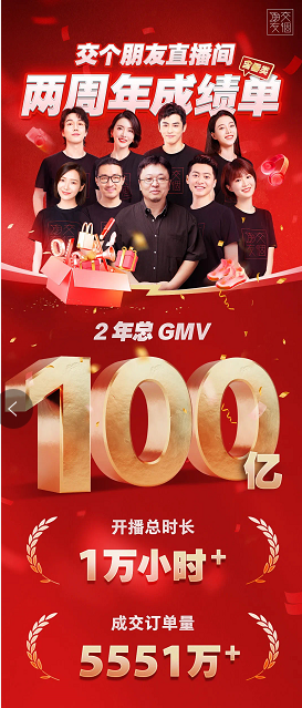 據(jù)悉,此前4月11日,交個朋友公眾號發(fā)布2周年報告,數(shù)據(jù)顯示,過去2年交個朋友總GMV達100億元,開播總時長達1萬小時+;團隊方面,交個朋友員工從最初7個人,發(fā)展到目前的1400多人;主播團隊也從早期3個主播,擴展到目前40人+,開播頻率和時長從1周1播,提升到當前的1周7播。并建立起美妝、服飾、運動等各個垂直領(lǐng)域的直播賬號矩陣。