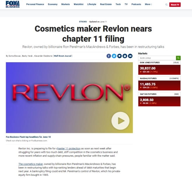 根據(jù)美國福克斯新聞網(wǎng)報(bào)道,“由于債臺高筑、通貨膨脹、美妝市場競爭激烈,再加上疫情阻礙供應(yīng)鏈正常運(yùn)轉(zhuǎn),多因素影響下,露華濃不堪重負(fù),最快將于下周啟動(dòng)破產(chǎn)保護(hù)重整計(jì)劃”。該公司其股價(jià)在上周五下跌 53% 至每股13.64元。