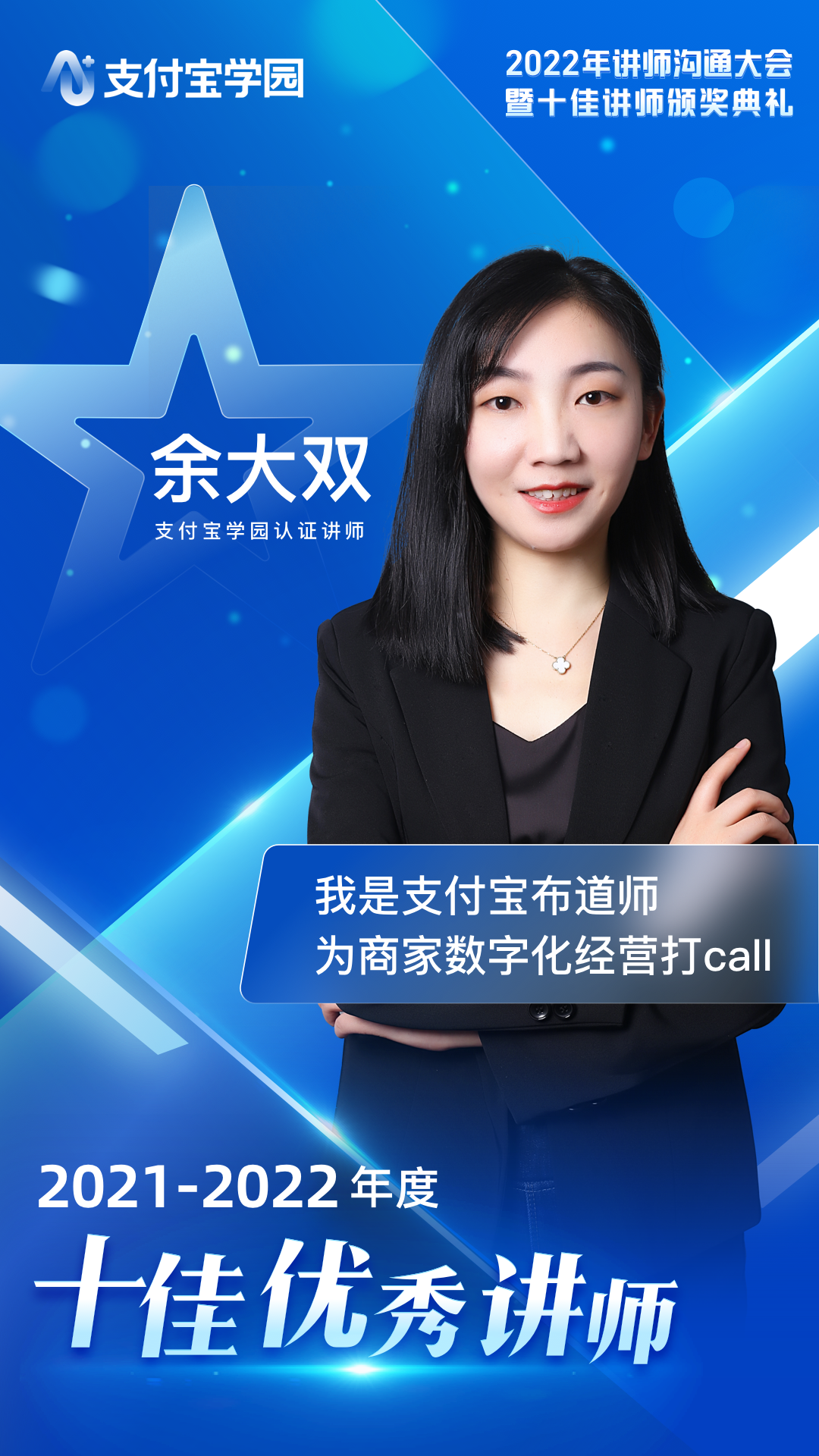 支付寶學(xué)園從參賽講師中嚴(yán)格遴選出了理論能力及實(shí)操技能俱佳的優(yōu)秀講師,其中,中皖知托付新零售運(yùn)營(yíng)中心DT增值服務(wù)事業(yè)部運(yùn)營(yíng)總監(jiān)余大雙在歷經(jīng)長(zhǎng)期的講師評(píng)選后,從層層選拔中脫穎而出,成為支付寶學(xué)園“2021-2022年度十佳優(yōu)秀講師”之一。