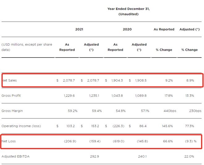 僅從財報看,一年過去,露華濃還在虧。2021年露華濃凈銷售額為20.787億美元,凈虧損約2.07億美元;而在2020年,露華濃凈虧損約6.19億美元,2019年為1.57億美元。表面來看虧損雖有收窄跡象,但排除2020年突如其來的疫情影響,露華濃的虧損額相比2019年仍在加劇。