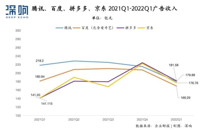 除了拼多多,廣告收入超越百度的京東在今年一季度廣告收入達(dá)到176.76億元,同比增長(zhǎng)25.18%。
