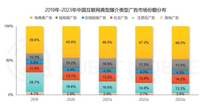 一直以來(lái),電商廣告在互聯(lián)網(wǎng)廣告中的市場(chǎng)份額就是最大,并且從Quest Mobile報(bào)告來(lái)看,近年來(lái)其市場(chǎng)占比還在持續(xù)增長(zhǎng)。產(chǎn)生這一現(xiàn)象的原因在于有電商業(yè)務(wù)的平臺(tái)可以實(shí)現(xiàn)用戶(hù)“所見(jiàn)即所得”,看到廣告直接跳轉(zhuǎn)產(chǎn)生購(gòu)買(mǎi),其轉(zhuǎn)化鏈路“天然”就更短。最貼近交易,轉(zhuǎn)化效率更高,對(duì)商家具有更強(qiáng)的吸引力也就順理成章。