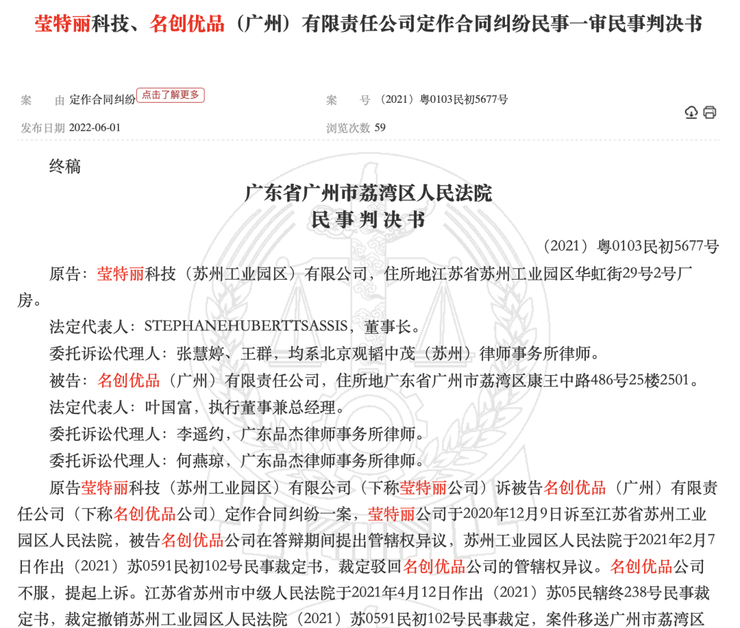 近日,名創(chuàng)優(yōu)品與化妝品代工廠(chǎng)瑩特麗合同糾紛民事判決書(shū)在中國(guó)裁判文書(shū)網(wǎng)上公示,兩次訴訟中,名創(chuàng)優(yōu)品均敗訴。