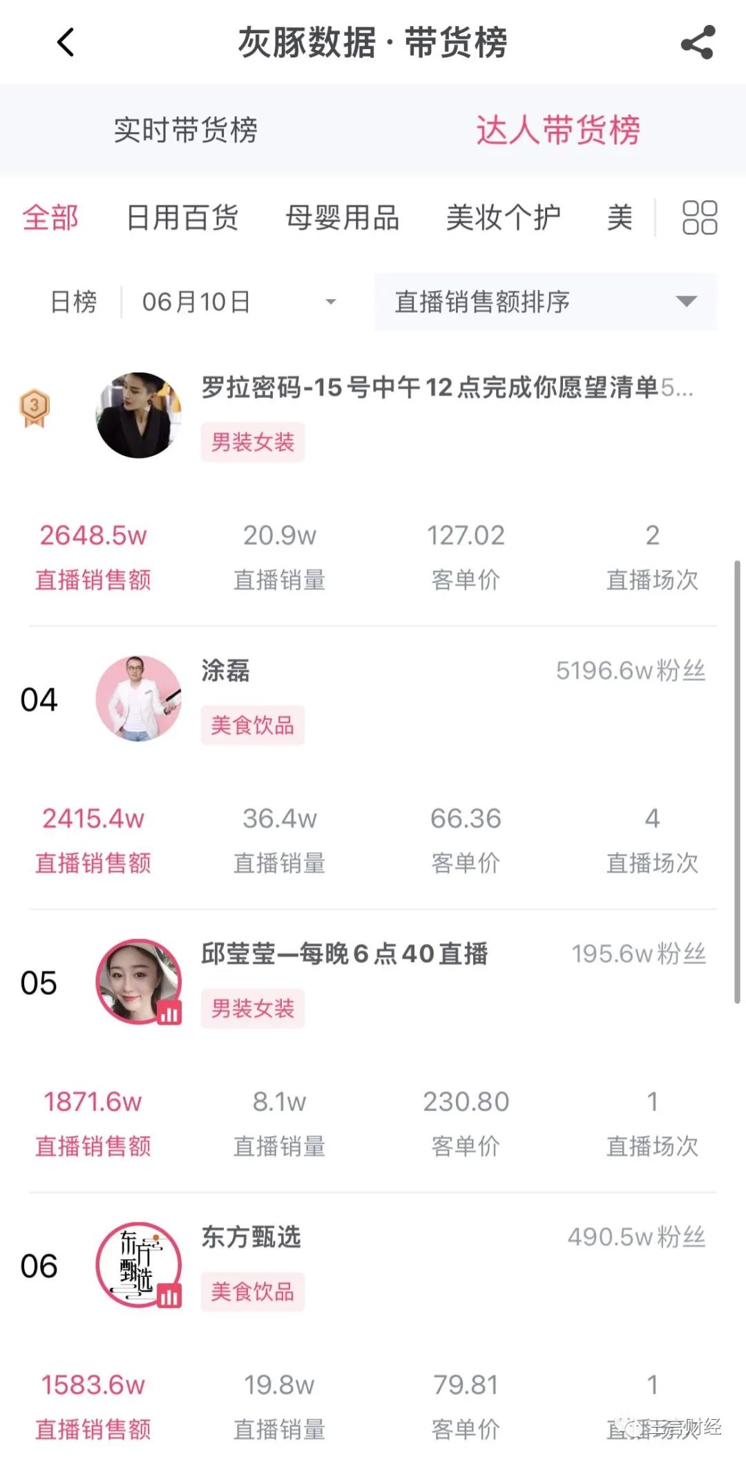 另外在6月的前兩周的周榜中,除了賈乃亮、交個朋友、新疆珠寶玉石業(yè)這些在月榜里出現(xiàn)的外,廣東夫婦則在這兩周的銷售額都排名第一。