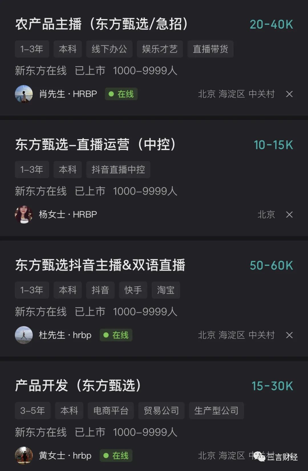 此外,三言財經(jīng)注意到,在招聘平臺中,東方甄選正在大量招聘帶貨主播、運營客服等崗位。其中,主播工資為20至60K不等。