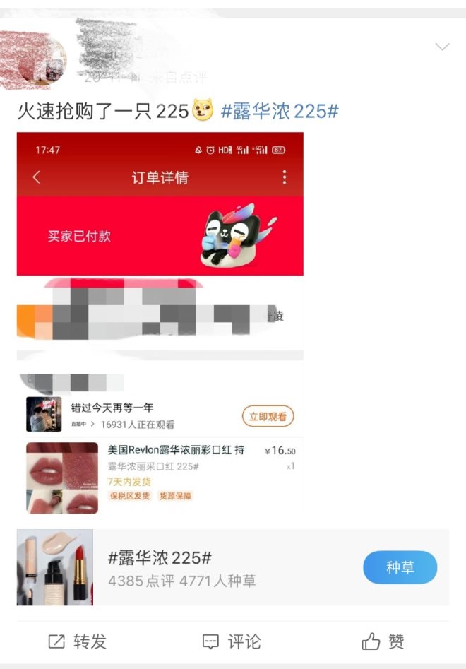 品牌的明星單品“露華濃225”、“露華濃325”等詞條也隨之沖上熱搜,甚至帶動(dòng)了一股搶購(gòu)熱潮。