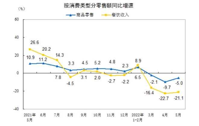 按消費(fèi)類(lèi)型分,1-5月份,商品零售155415億元,同比下降0.7%;餐飲收入16274億元,下降8.5%。5月份,商品零售30535億元,同比下降5.0%;餐飲收入3012億元,下降21.1%。
