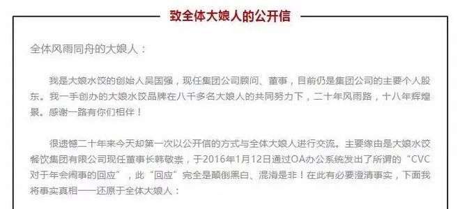 吳國強(qiáng)在網(wǎng)上發(fā)表公開信,控訴大娘水餃內(nèi)幕