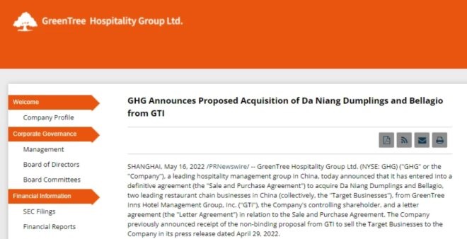 上月,格林豪泰方消息,格林豪泰酒店管理集團(tuán)有限公司(GTI)收購“大娘水餃”和“鹿港小鎮(zhèn)”已簽署最終協(xié)議,收購價(jià)以美元支付,相當(dāng)于約3.998億元人民幣,預(yù)計(jì)將在2022年下半年發(fā)生。