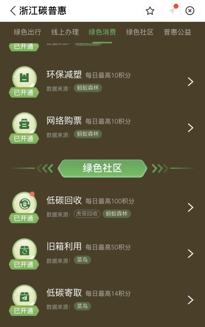 菜鳥接入浙江碳普惠平臺以后,快遞消費者參與菜鳥快遞包裝回收、低碳寄取、舊箱再利用,都可以在浙江碳普惠平臺形成碳積分,獲得上述權(quán)益。