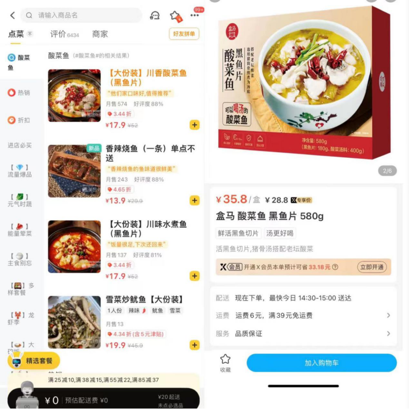比如,以酸菜魚為例,杭州盒馬鮮生門店的預(yù)制菜產(chǎn)品酸菜魚售價約36元,在外賣平臺上酸菜魚+米飯的套餐價格基本不到20元。