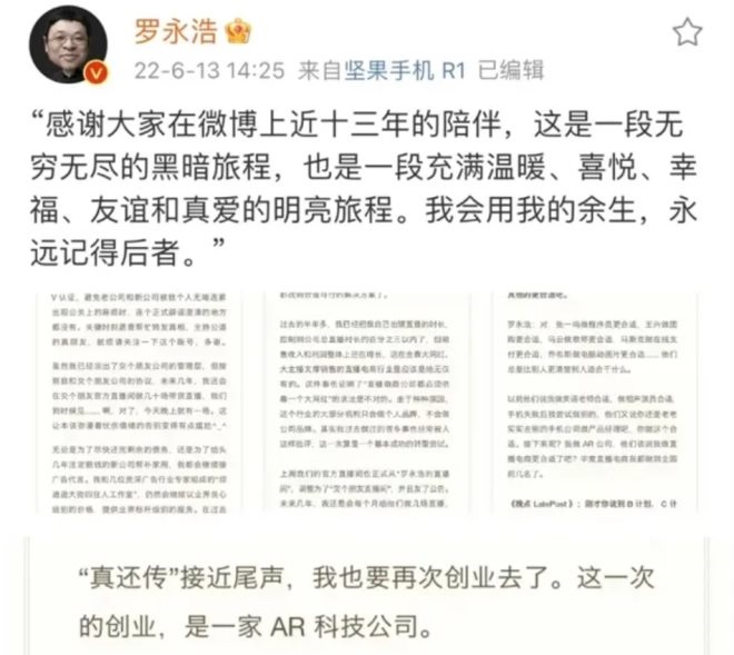 6月13日,羅永浩在微博發(fā)文稱:“‘真還傳’接近尾聲,我也要再次創(chuàng)業(yè)去了。這一次的創(chuàng)業(yè),是一家AR科技公司”。隨后,羅永浩正式“退網(wǎng)”,擁有1775萬粉絲的“羅永浩”微博賬號更名為“交個朋友直播間”。