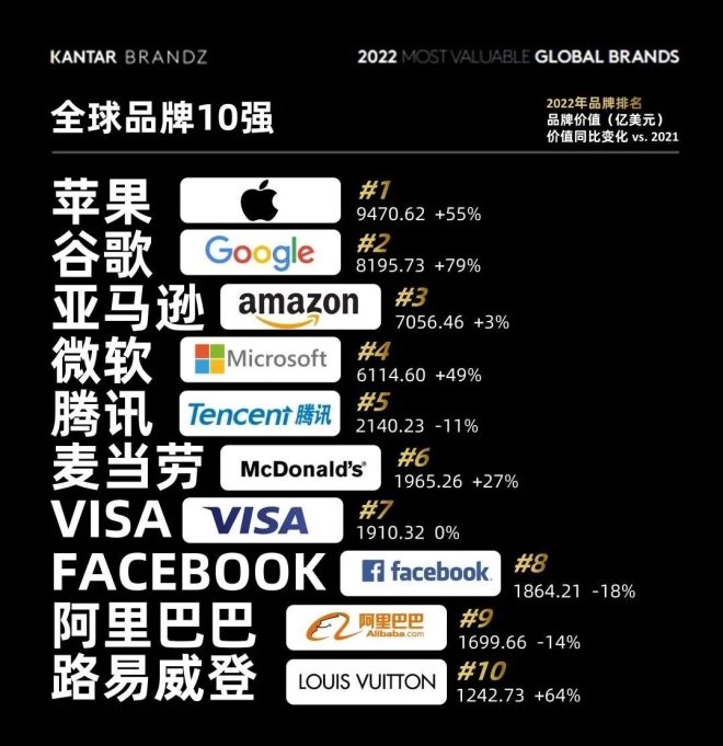 騰訊和阿里分別為第5位和第9位,品牌價(jià)值分別為2140.23億美元和1699.66億美元,同比均有所下跌。