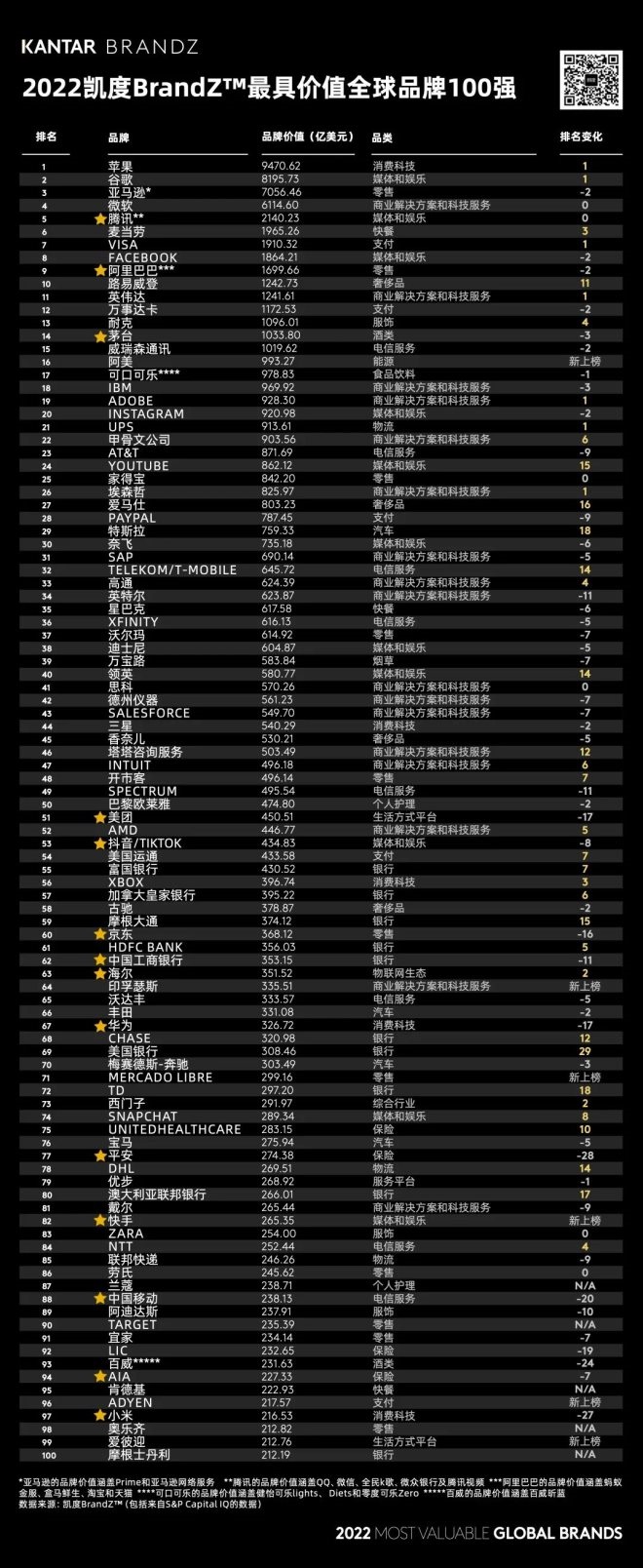 14家中國(guó)品牌入選2022年BrandZ全球品牌百?gòu)?qiáng)榜