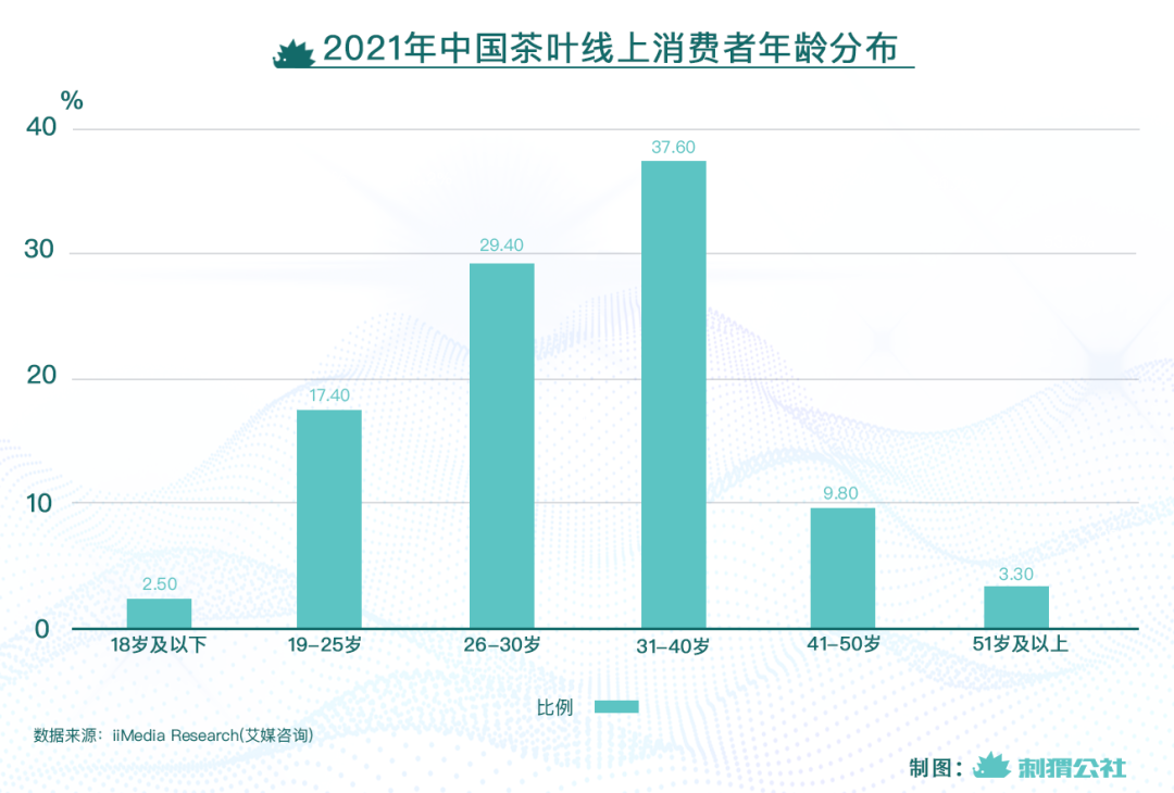 再根據(jù)艾媒咨詢的數(shù)據(jù),2021年中國茶葉線上消費者中,19-30歲人群占比已達46.8%,超過了31-40歲人群的37.6%。這意味著,年輕人正崛起成為線上茶葉消費的主力軍。